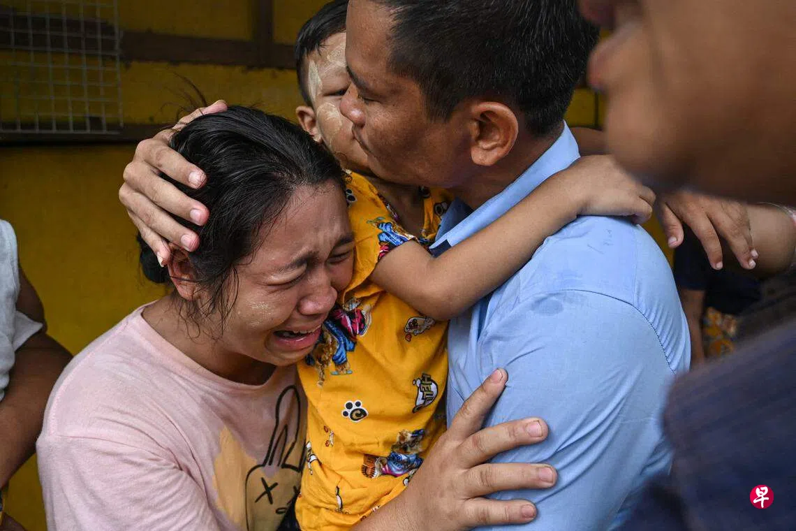 为庆祝佛教卫塞节并出于人道主义等考虑,缅甸国家管理委员会星期三(5月3日)发布特赦令,共赦免在全国多个监狱服刑的2153名囚犯,当中多数为反军方的异见人士。根据刑法,被赦免者若再次犯罪,需继续执行未完成的刑期。此前, 缅甸在1月4日独立日和4月17日缅历新年分别赦免了7012名囚犯和3118名囚犯。图为一名在仰光永盛监狱获释男子与妻儿团聚的感人一幕。