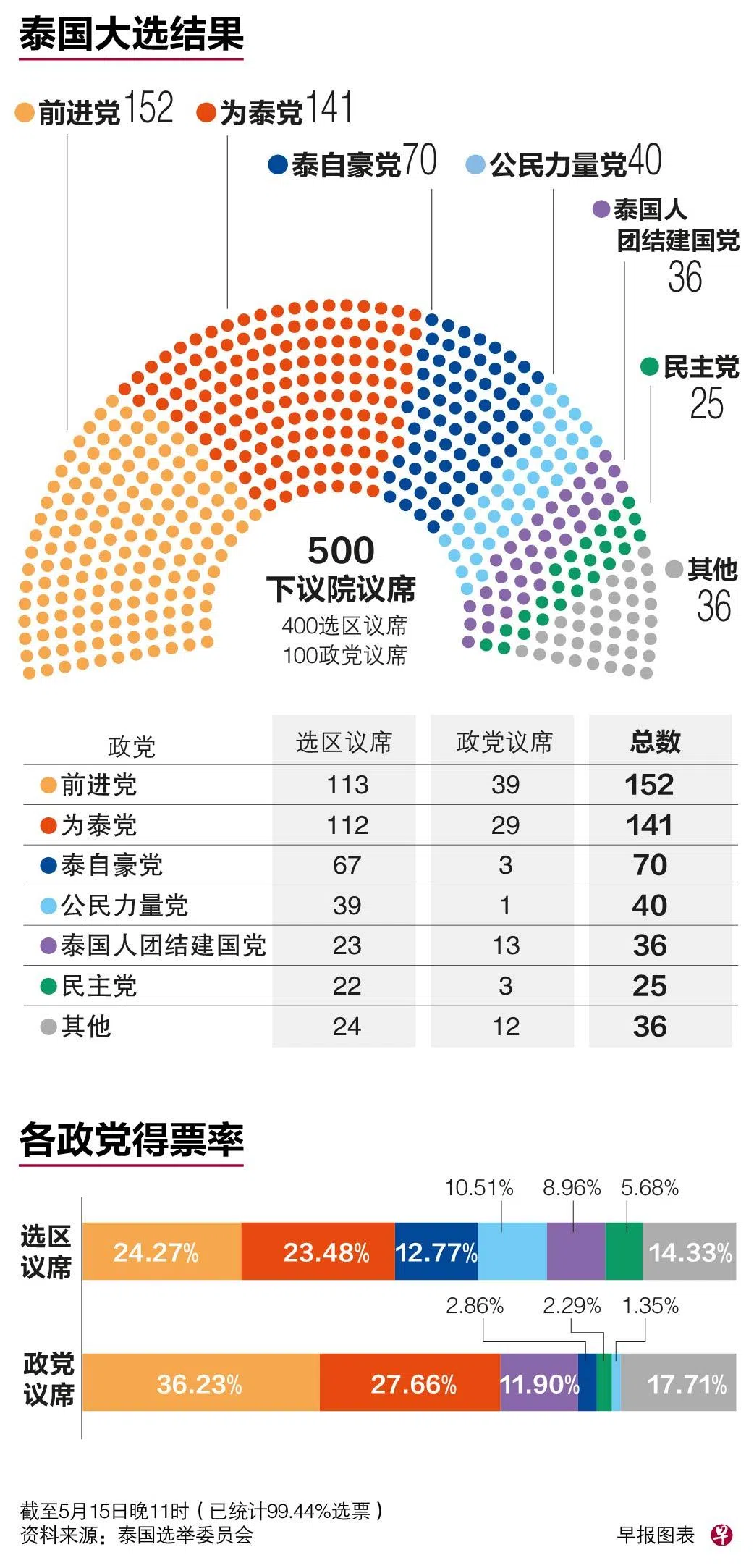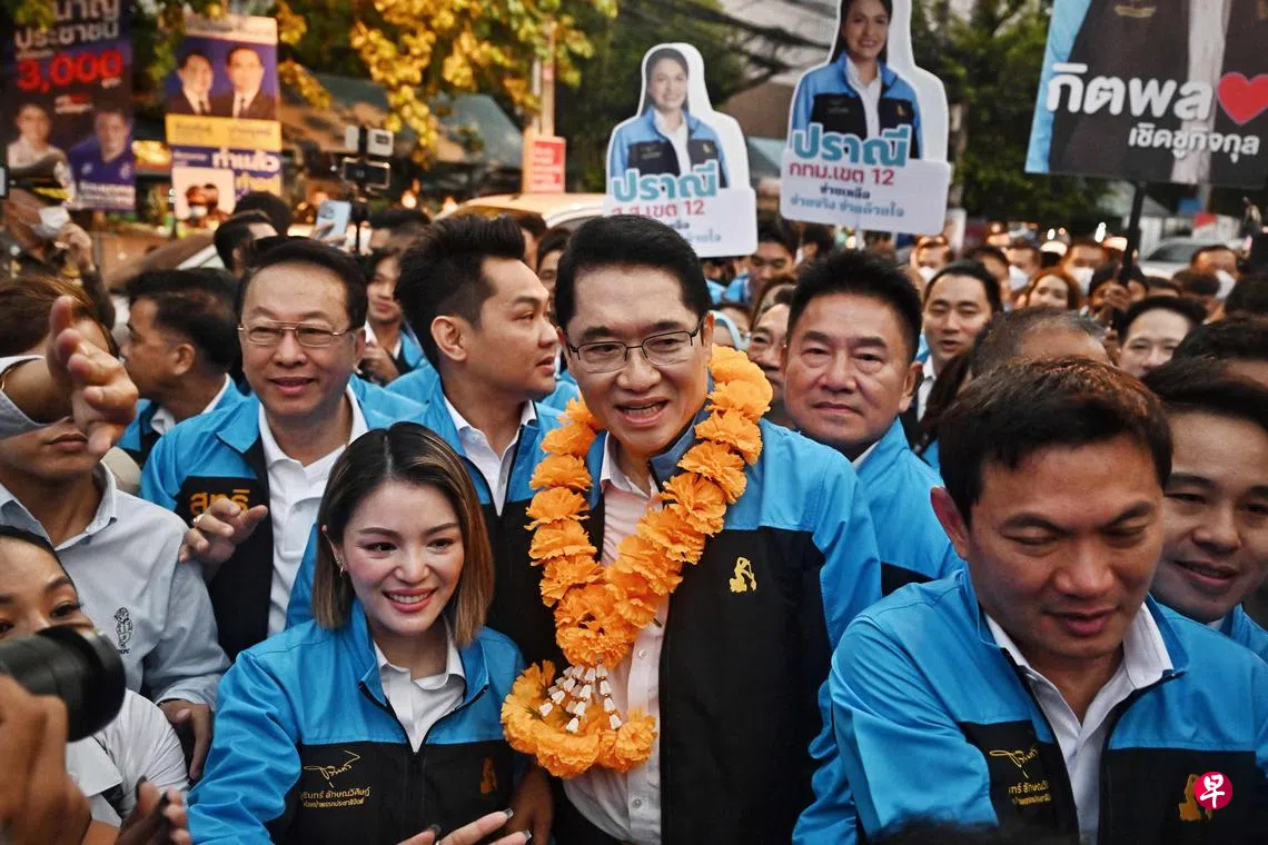 泰国大选投票于星期天(5月14日)结束,截至星期一(15日)中午,民主党仅拿下22个选区议席和三个政党议席。