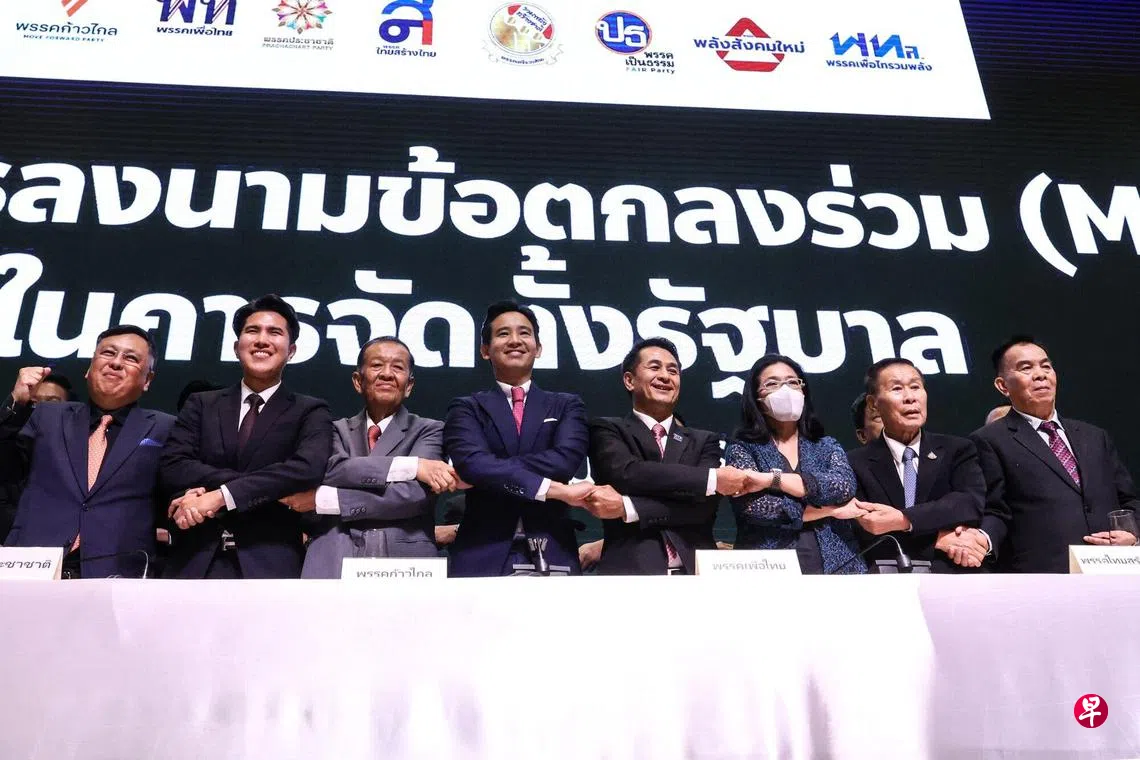 前进党和为泰党等八个政党刚在星期一(22日)签署合作协议,准备在国会开会时支持前进党党魁披塔出任首相和组织联合政府。