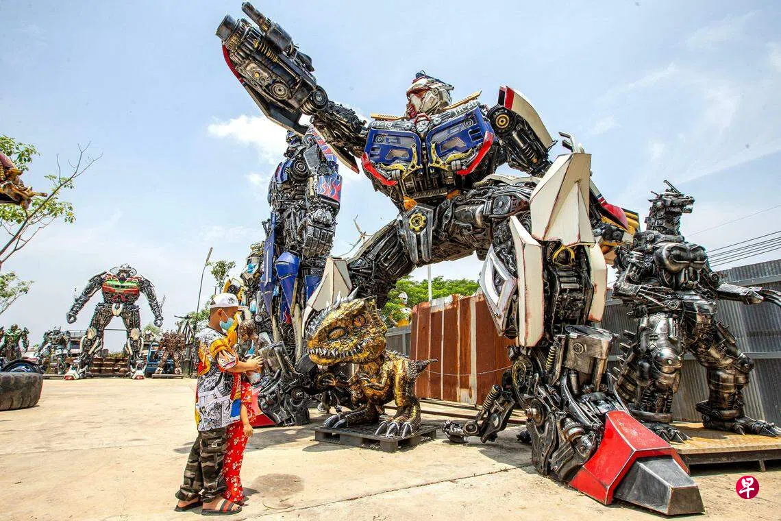 距离泰国首都曼谷约100公里的红统府,有一座变形金刚博物馆,这里展示着上百个由废旧金属和塑料等打造的艺术品,主题多半是动漫或电影人物,希望借此传达环保理念,唤醒人们的环保意识。图为一对小兄妹被一个用废金属制作的“变形金刚”深深吸引。
