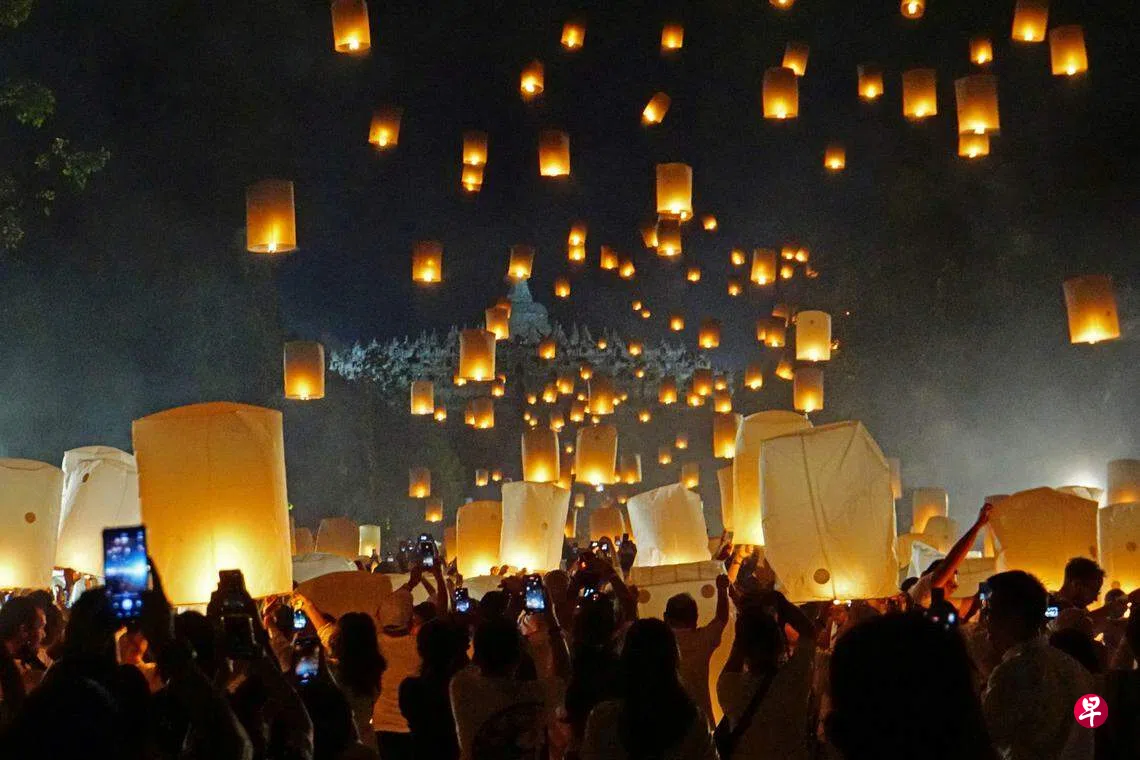 印度尼西亚佛教徒和僧人星期天(6月4日)在中爪哇省马吉冷县婆罗浮屠前,参加了今年的卫塞节庆祝活动,放飞上千盏天灯,照亮漆黑的夜空和婆罗浮屠佛塔。