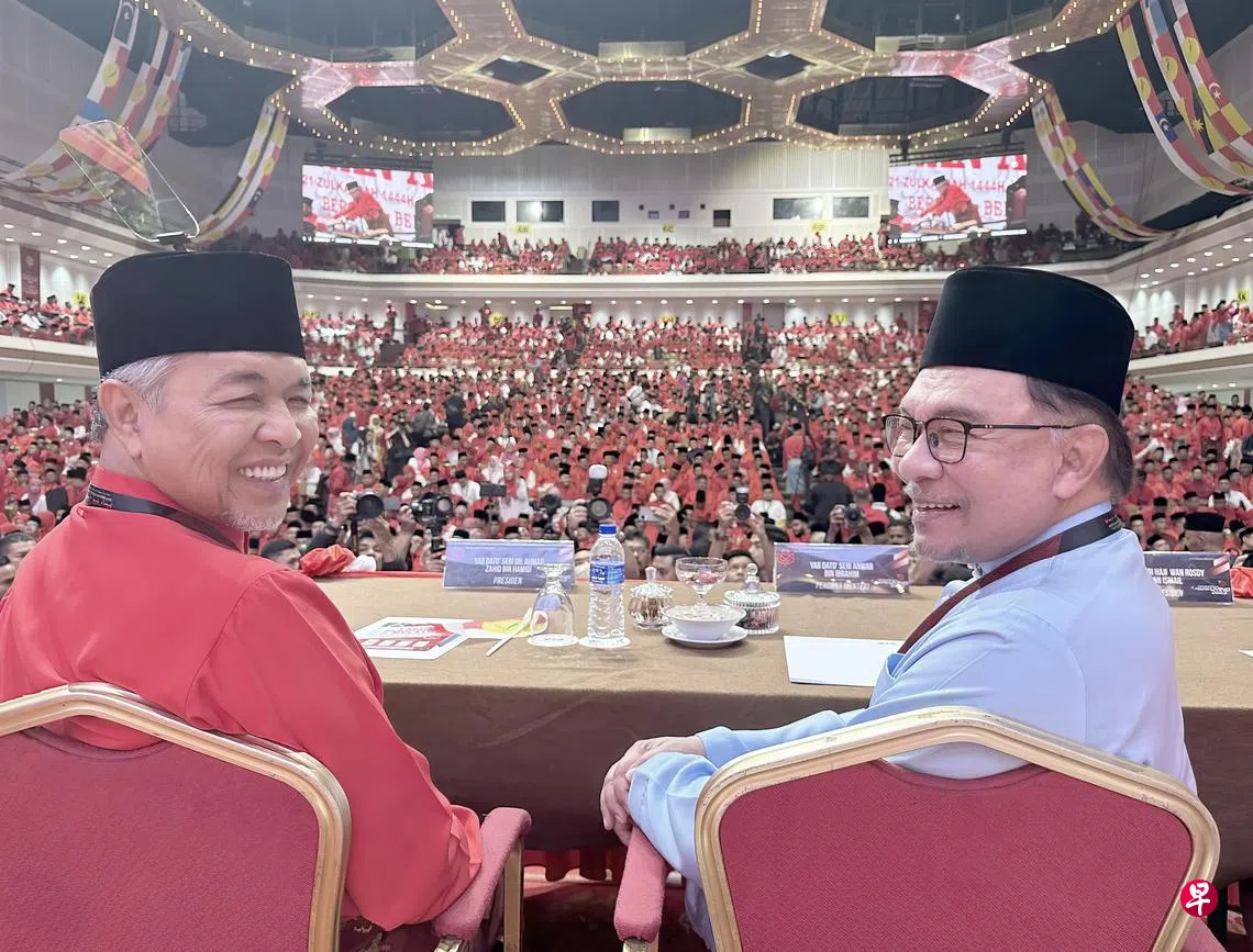 马来西亚首相安华(右)被安排坐在阿末扎希身边的主宾席,见证今年度巫统大会开幕。 (取自阿末马斯兰脸书)