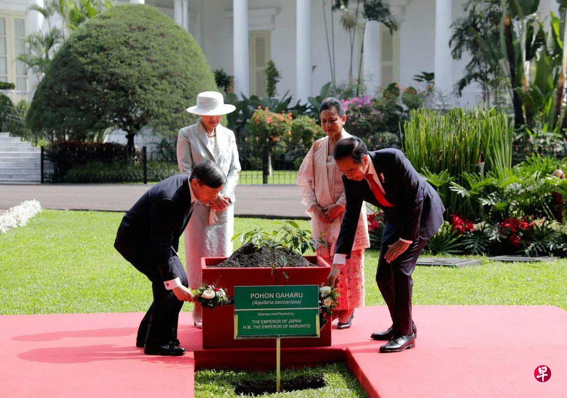 佐科夫妇陪同天皇夫妇在总统府花园散步,并举行植树仪式。