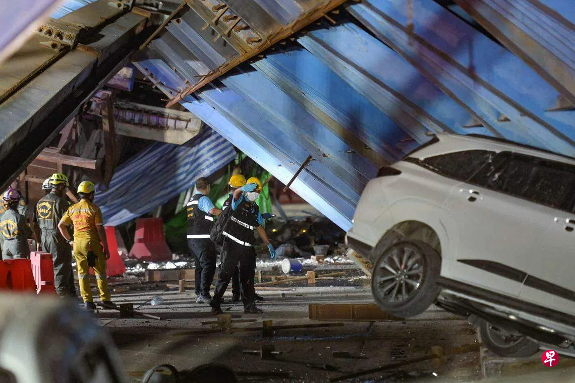 据《曼谷邮报》报道,初步调查发现,当时一台正在吊装高架桥的起重机突然翻覆,导致整段路的混凝土坠落,砸中周边建筑并压毁路上车辆。两名死者在车内当场死亡。