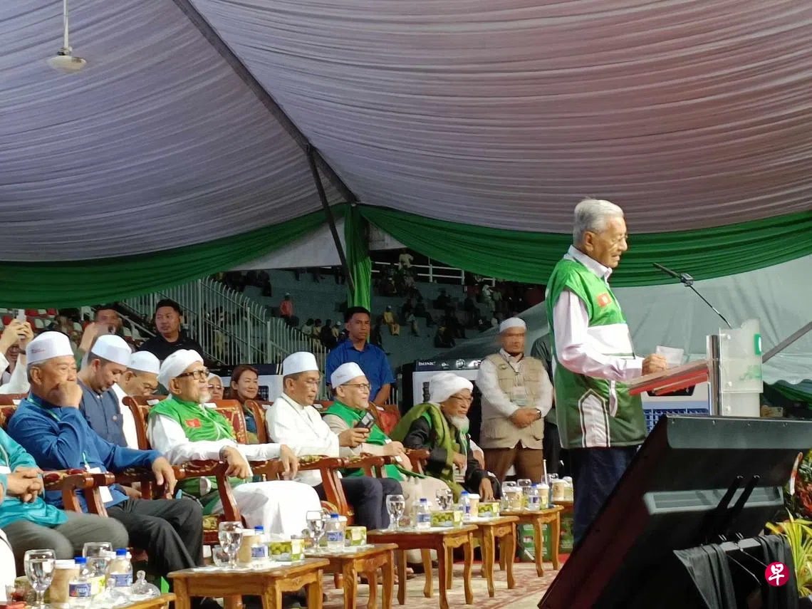 马哈迪星期五(7月21日)晚穿着伊斯兰党的青色外套,在吉兰丹州哥打峇鲁体育馆对着数千人进行演讲,促请马来人团结一致。同台的国盟领袖包括前首相及土著团结党主席慕尤丁,以及伊斯兰党主席哈迪阿旺。