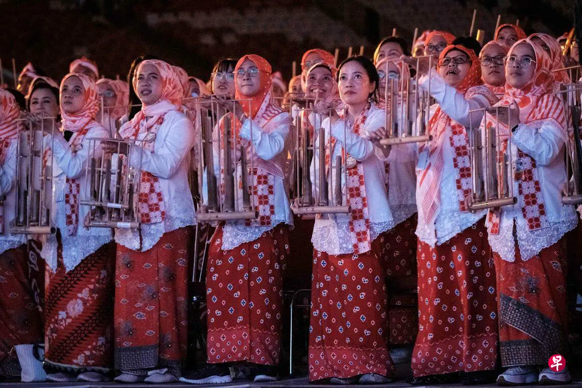 健力士评估员在台上一声令下,1万多名乐手奏起印尼爱国歌曲《飘扬吧,我的国旗》(Berkibarlah Benderaku)和德国蝎子乐队的民谣《变迁之风》(Wind of Change)。这项活动花了一整年时间策划,苦练了三个月,才能确保1万5000多人能整齐演奏印尼传统乐器安格隆。(法新社)
