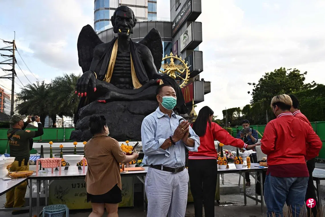 这座位于曼谷四星级市集酒店(Bazaar Hotel)外的黑色巨型雕像,背后长着一对翅膀,有金色獠牙、猩红色爪子及眼珠,被称为“盖乔大师”(Kru Kai Kaew),一些人视它为财神。
