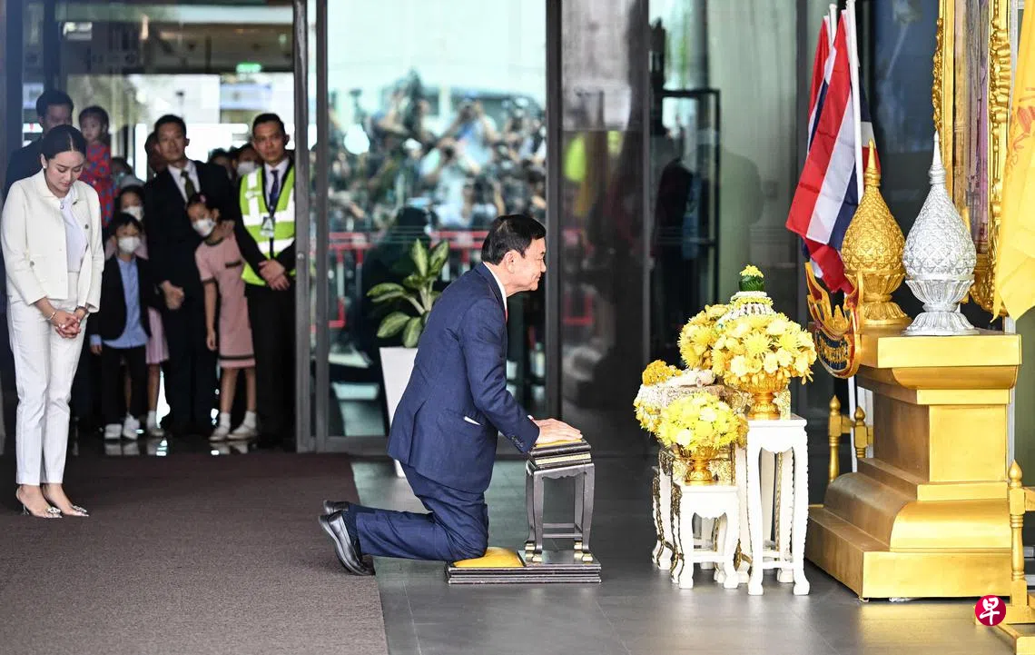 现年74岁的达信星期二(8月22日)早上9时,搭乘私人飞机从新加坡飞抵泰国廊曼机场。数千名身穿红衣的达信支持者及多名为泰党领袖,一早就聚集在机场外迎接达信回国。
