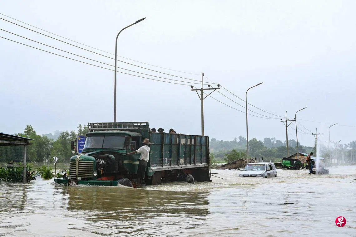 缅甸消防局勃固地区副局长吴丹吞乌说,当地时间凌晨4时起(新加坡时间凌晨5时30分),勃固河已超过临界水位,救援行动于当地时间早上6时左右开始。图为一辆卡车在帕杨基镇被水淹没的街道上行驶。