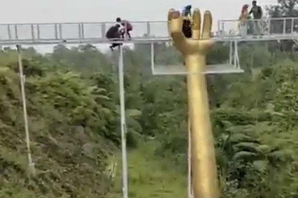 中爪哇省邦尤马斯县林帕库乌斯松树林(Limpakuwus Pine Forest)的The Geong玻璃桥,上星期三(10月25日)上午发生骇人事故。桥面玻璃突然破裂,两名游客从10米高坠地,其中一人不幸身亡,另一人受轻伤。另外两人及时抓住桥身而未坠地,由旁人拉起救回,场面惊心动魄。