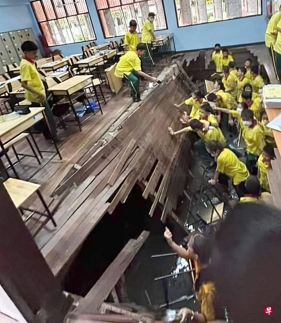 事发教室位于一栋已使用超过47年、三层高教学楼的一楼。据泰国《民族报》报道,事发时学生们一起跑向黑板抢答问题,木制地板相信承受不住重量而塌陷,坑内还有积水。