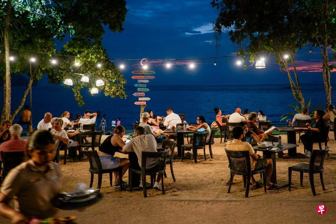 为促进旅游业复苏,泰国首相社德他上个月宣布一系列措施,包括在上述地区试行延长夜店营业时间,打造夜生活旅游生态。图为游客在著名海岛度假胜地甲米(Krabi)的海边享用晚餐。(法新社)