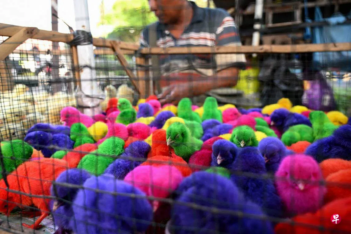 印度尼西亚峇厘岛的伯林吉(Beringkit)市集里,五颜六色的小鸡挤满笼子,总是吸引无数路人驻足围观。如果想带回家,每只只需5000印尼盾(约0.43新元)。