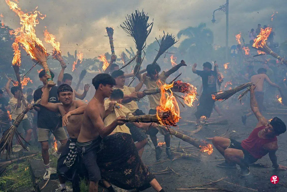 印度尼西亚龙目岛马塔兰(Mataram)的印度教徒星期一(3月11日)在庆祝静居日(Nyepi Day)前夕参加传统仪式“Perang Api”——信徒拿着火把战斗,这样可以净化邪恶和远离不幸。静居日也称为“安宁日”,是峇厘岛和龙目岛等地印度教徒的新年。与大多节日的喜庆热闹不同,印度教徒在静居日当天进行24小时的禁食、冥想,关掉电源并与家人待在家里。峇厘岛的所有活动完全停止,整个岛屿完全安静下来,与平时的熙来攘往截然不同。(路透社)