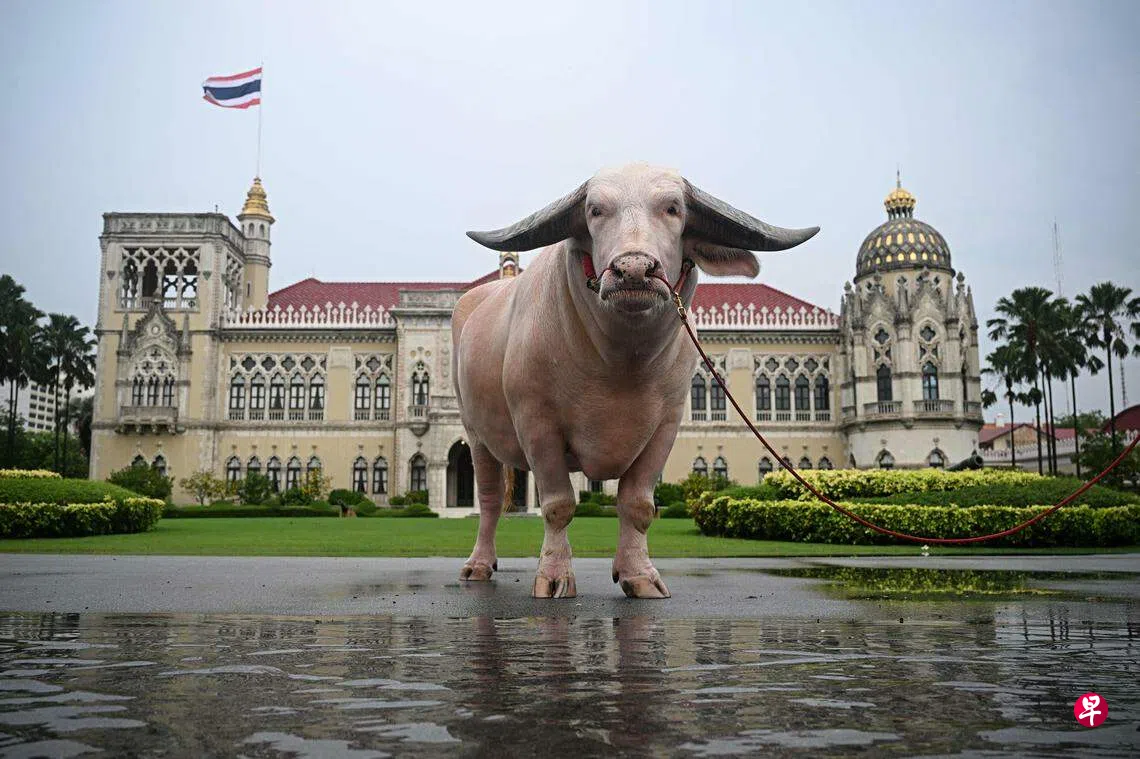 泰国首相社德他星期三(3月20日)在首都曼谷的政府大楼前接见了一名不寻常的访客——一头身价高达50万美元(约67万新元)的白化水牛。