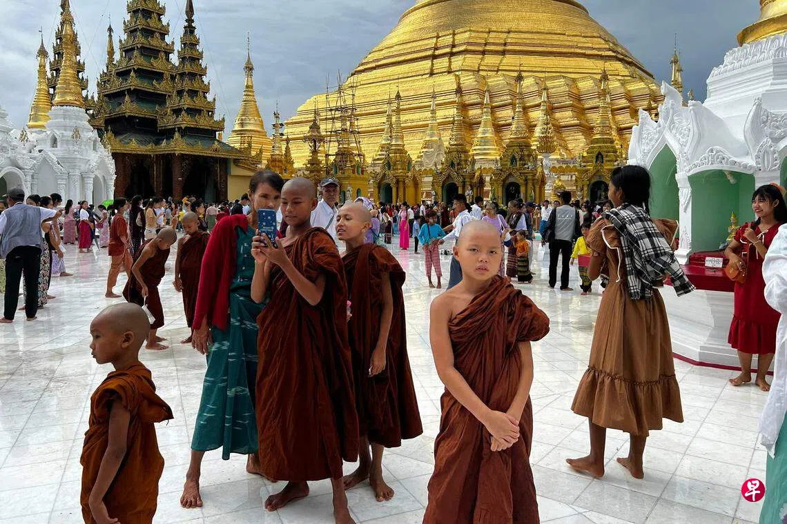 卫塞节落在缅历每年2月的月圆之日。当地民众除了在这天欢庆佛陀的生日,也会到大金塔浇灌一棵神圣的菩提树。大金塔是全球最古老的佛塔之一,因供奉佛陀的发丝而被佛教徒视为圣地。图为一名小沙弥星期三到大金塔拜佛时,不忘用手机拍照留念。(法新社)