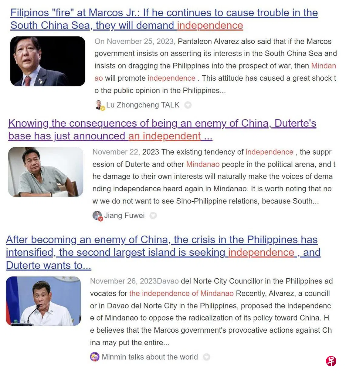 (菲律宾讯)菲律宾现任总统小马可斯和前任总统杜特尔特对国家政策和外交政策产生分歧,去年底一度出现将棉兰老岛从菲律宾分离出去的呼声。《菲律宾星报》的调查发现,中国社交媒体用户利用棉兰老岛从菲律宾分离出去的呼声,进行有组织的舆论制造行动,散布小马可斯挑衅引发菲律宾内战的谣言。