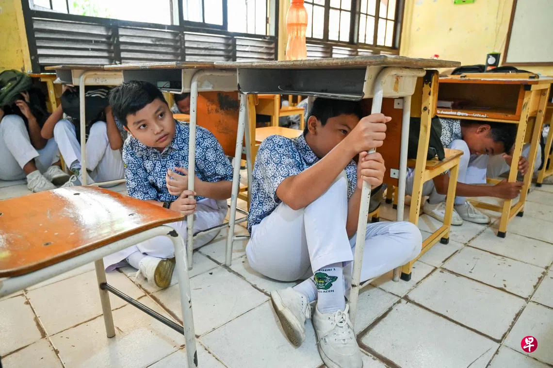 印度尼西亚地处环太平洋火山带,是地震和火山喷发的高发区之一。为确保学生知道灾难发生时如何应对,印尼苏门答腊北部的亚齐省首府班达亚齐(Banda Aceh)星期三(8月7日)举行地震和海啸演习,当地初中生在老师的指令下纷纷躲到桌下。
