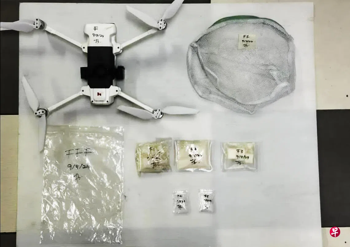 霹雳州警方星期五(9日)接获打巴监狱官员投报,指他们巡逻时发现一架可疑的白色无人机停在监狱建筑物的屋顶,取下查看后发现它挂着一个洗衣袋,里面藏有五包疑似海洛英和冰毒的毒品,相信是有人试图利用无人机将毒品运入监狱。