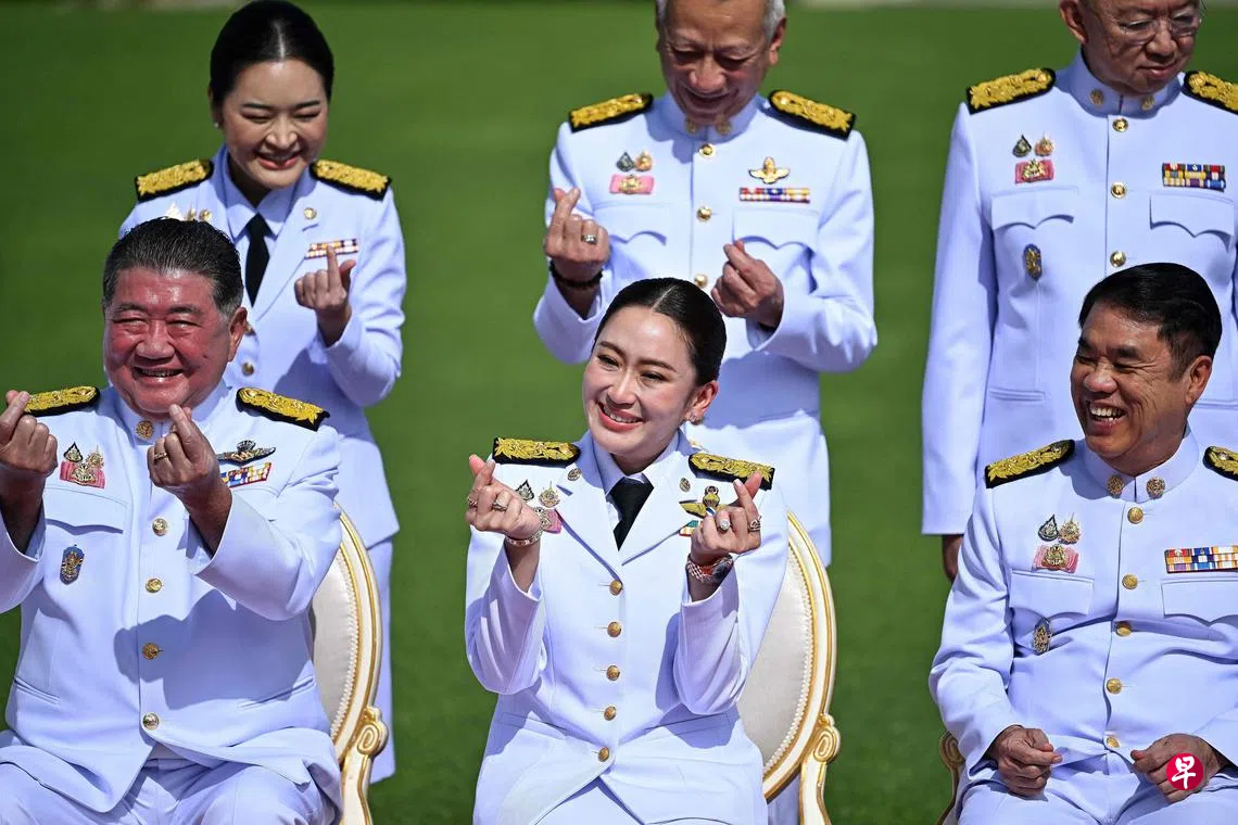 (曼谷综合电)泰国新首相佩通坦尚未正式开始治理国家,就已面临一连串针对她任相资格的投诉,甚至连在首相府大楼前带领内阁成员拍照时一起做出比心的手势,也被指涉嫌违反道德标准。