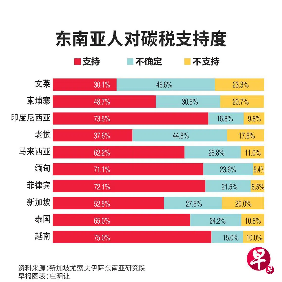 新加坡有两成受访者反对碳税,另两个国家是文莱(23.3%)和柬埔寨(20.7%)。