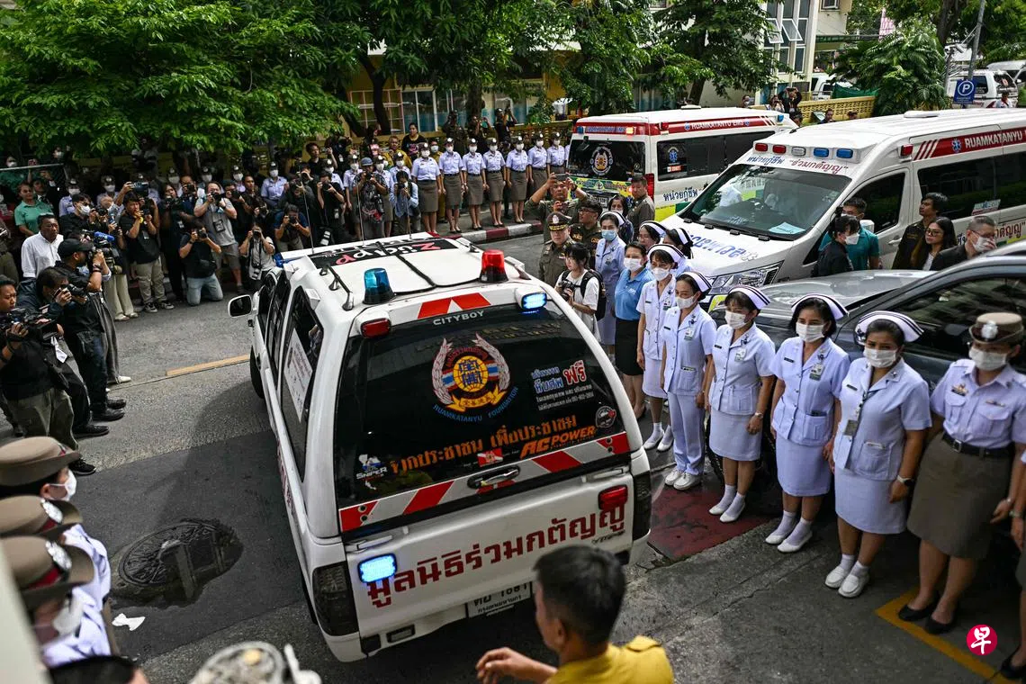 多名警察和护士星期三(2日)排列在道路两旁,目送载着死者遗体的救护车,驶出曼谷警察医院法医研究所。(法新社)