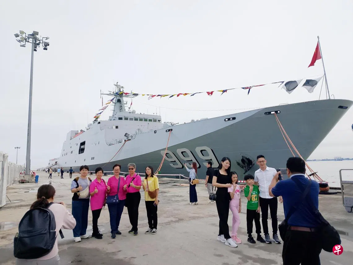 中国海军戚继光号训练舰和井冈山号登陆舰组成的83舰编队,上个星期六(10月5日)到马国展开为期三天的友好访问。期间,军舰停靠在槟城瑞典咸码头,让民众登舰参观。