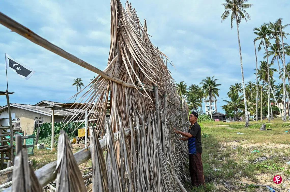 马来西亚每年11月至隔年3月刮东北季风,强风暴雨经常造成东海岸地区发生严重水灾,低洼及沿海一带的房子不是浸泡在洪水里,就是被狂风掀翻。在登嘉楼州马江县一个小渔村,54岁的渔民慕沙慕达忙着用干椰叶在屋外筑挡风墙,以期把强风带来的破坏降至最低。