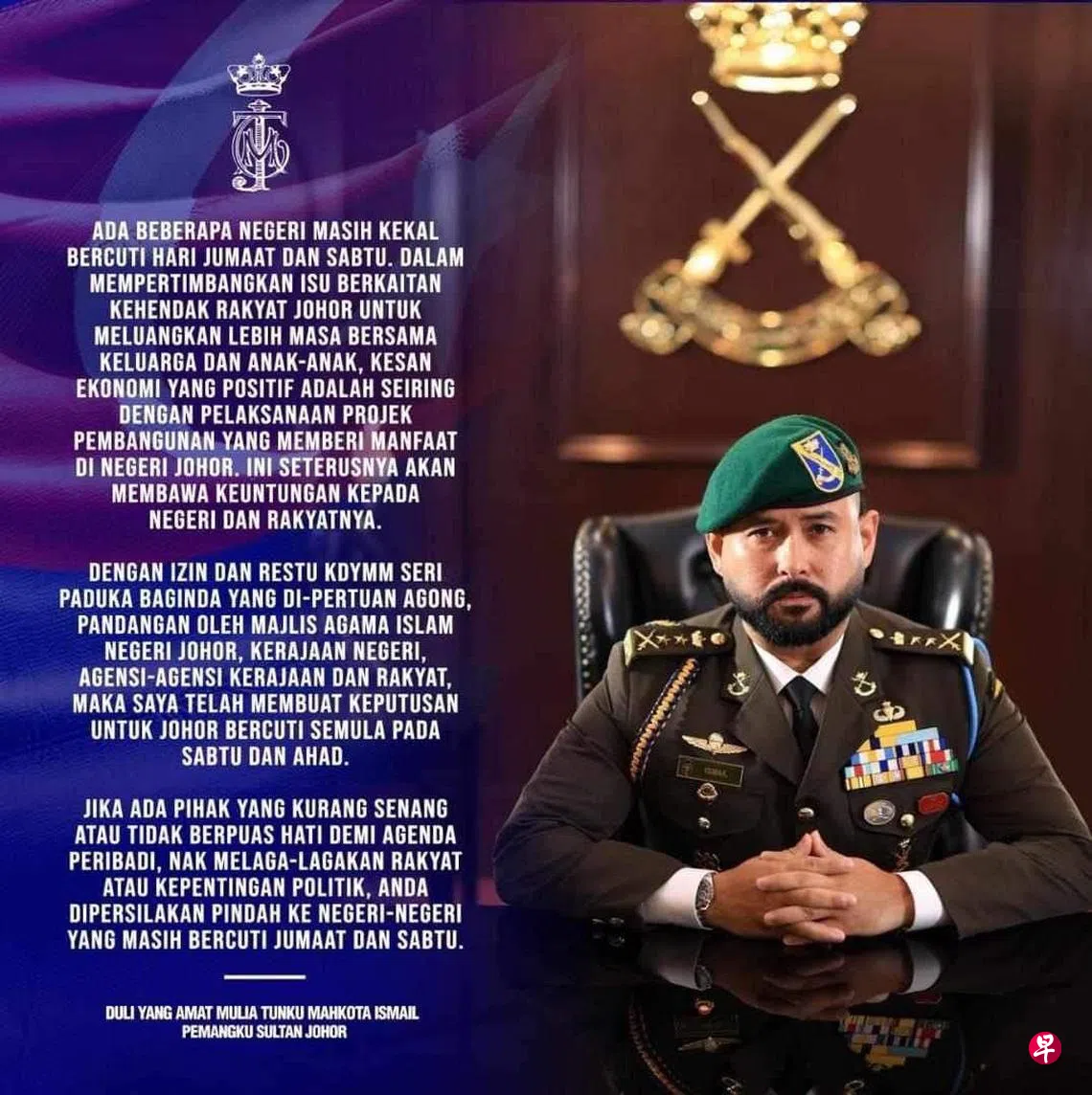 依斯迈星期一(7日)宣布,从2025年1月1日起,柔州官方周休日改为星期六和星期天。这项宣布普遍获得民众尤其是工商界人士欢迎,但也有部分人士不满官方任意调整周休日。