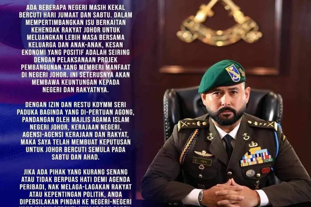 目前,柔佛州公共部门和学校的周休是星期五和星期六,许多私立学校与私人机构则休星期六与星期天。柔佛州摄政王依斯迈10月7日宣布,从明年1月1日起,柔州官方周休日改为星期六和星期天。