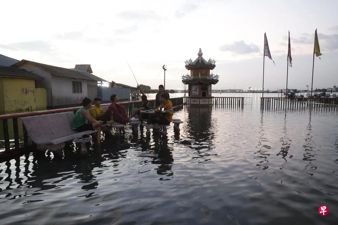 马来西亚雪兰莪州沿海地区遭遇大涨潮,巴生港口及吉胆岛码头周边主要道路星期五(10月18日)清晨严重淹水,水深约2米,车辆及电单车全都无法通行,上班时间交通大堵塞。图中吉胆岛大部分民宅、商店和工厂遭海水入侵,水位达成人小腿肚部位,许多物品如家具、货物等全浸泡在水中,损失惨重。