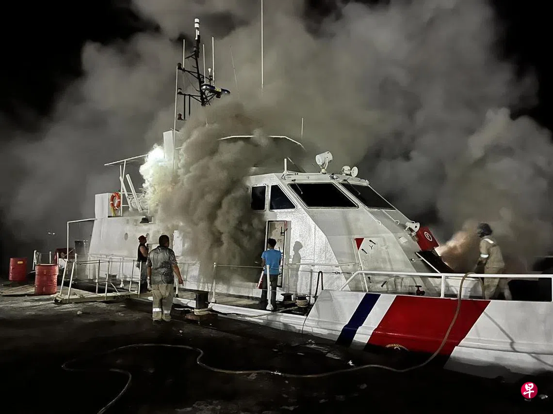(美里讯)马来西亚海事执法局一艘巡逻船在维修期间突然起火,船身约40%的面积被烧毁,所幸未造成人员伤亡。