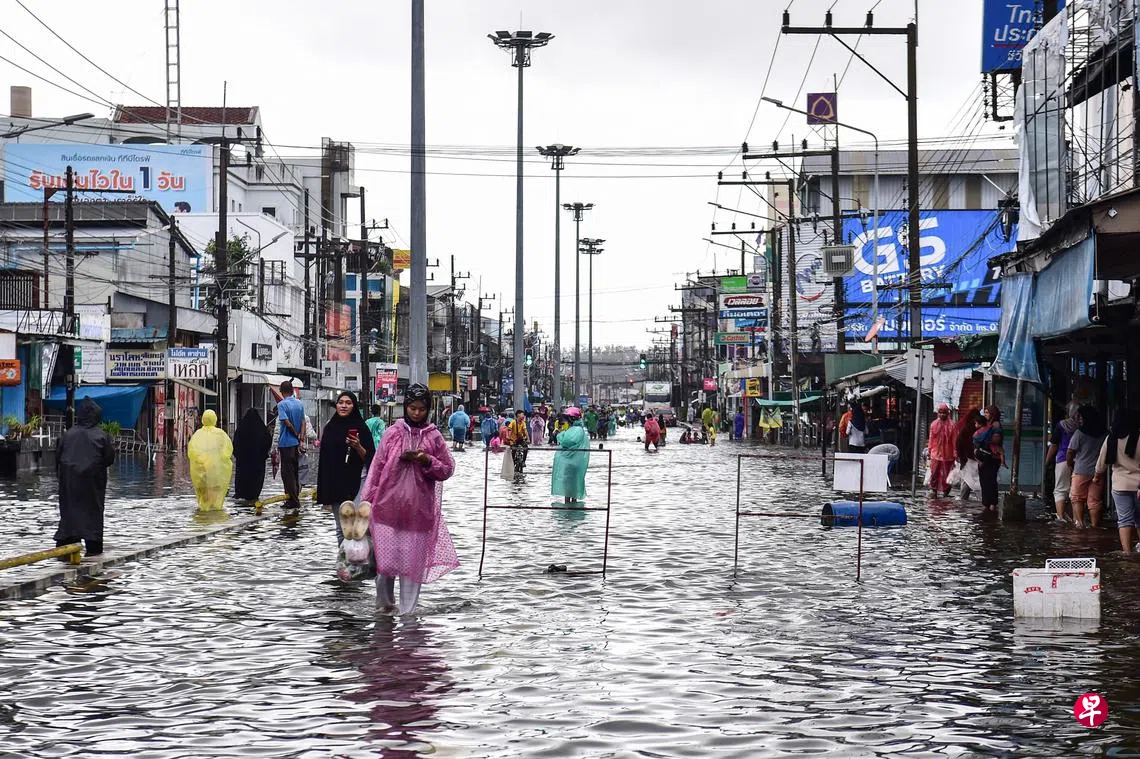 泰国南部及马来西亚北部地区连绵豪雨引发水灾,吉兰丹及登嘉楼两州约有1万人受影响。马国副首相及国家灾难管理委员会主席阿末扎希周三(11月27日)发文告说,大雨预计将持续到本周五(29日),他促请民众做好防备及提高警惕。图为靠近马来西亚边境的泰南陶公府市区在暴雨后汪洋一片,变成泽国。(法新社)
