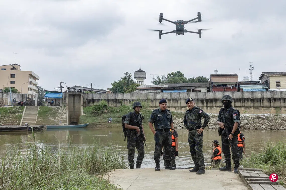 马国警察普通行动部队东南旅指挥官聂罗斯阿兹汉(右二)不时会到马泰边境哥乐河,视察无人机的巡逻情况。(马新社)