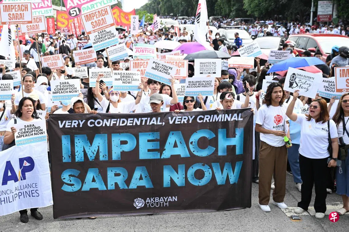 (马尼拉法新电)菲律宾数千人星期五(1月31日)走上马尼拉街头集会,敦促国会众议院弹劾副总统莎拉。