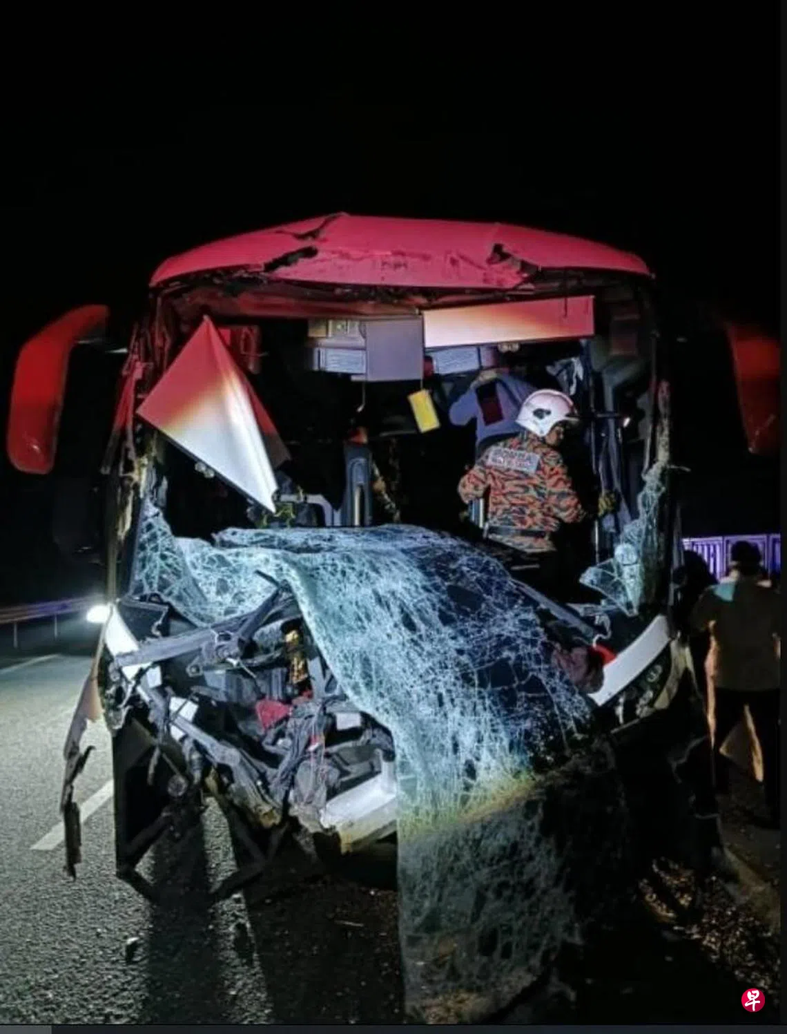 (古来综合讯)马来西亚一辆长途巴士星期天凌晨在南北大道柔佛州古来路段,疑因超速行驶,追尾撞上一辆油槽车,造成马国籍巴士司机和一名新加坡籍跟车员,以及20名乘客受伤送院。