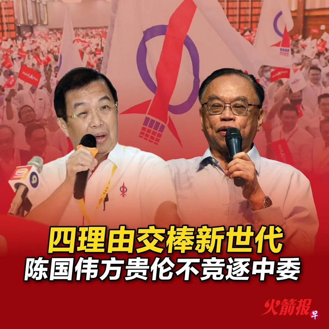 (吉隆坡综合讯)马来西亚联合执政党民主行动党全国顾问陈国伟及全国总财政方贵伦宣布,来临党选不再参加中央执行委员会选举,以便新一代领袖有更多发挥空间。