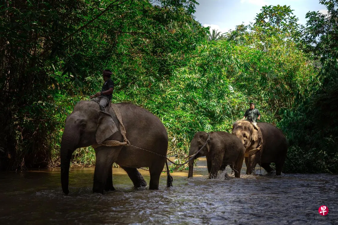 当局认为,霹雳州森林不断开发,导致象群越来越接近森林边缘的甘榜,是导致人象冲突不断发生的主要原因。因此当局利用已经养驯的大象诱捕野象,并将野象迁移到其他森林,希望减少人象冲突。从2020年至2023年,当局已经移走41只与人类冲突的野象。去年又移走32只,五年来总共迁移73只。图为霹雳州野生动物保护及国家公园局的两名原住民职员骑着驯象,护送中间的野象迁居森林深处。(马新社)