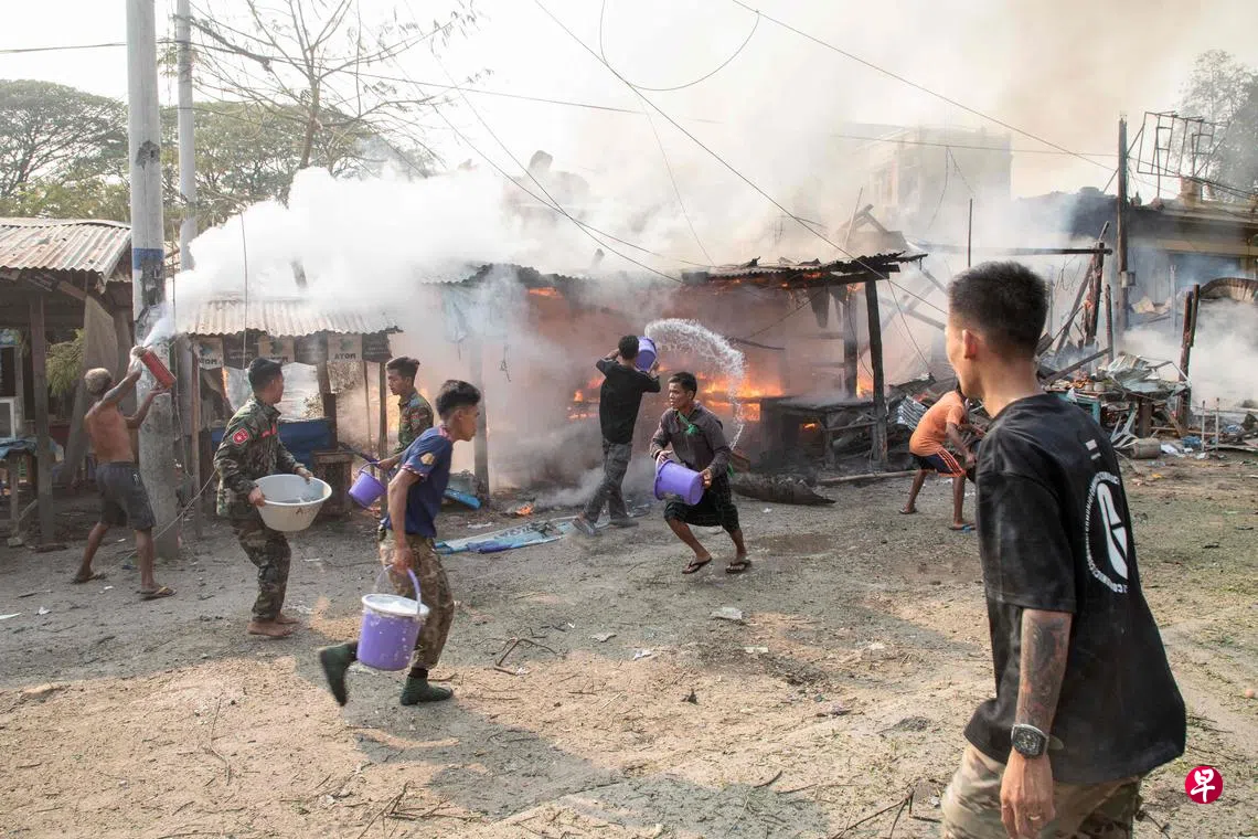 一些民宅和一家餐馆着火,一些人用水盆接水灭火。