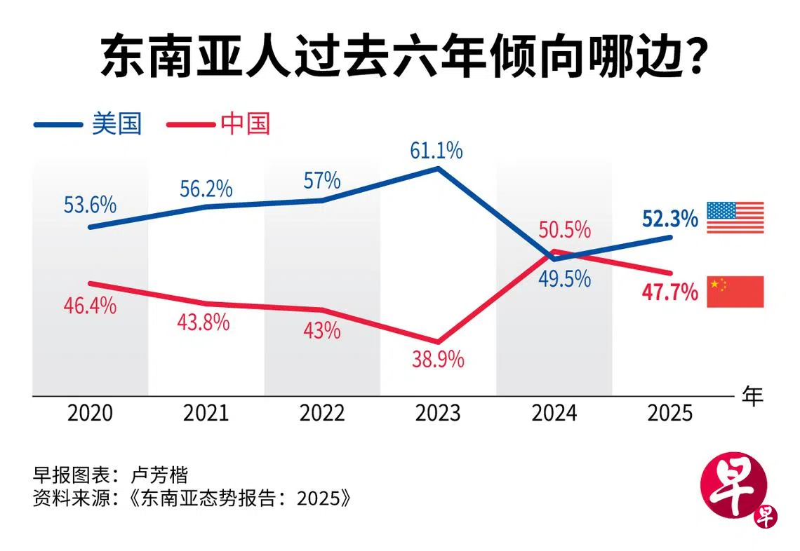 新加坡尤索夫伊萨东南亚研究院的最新年度调查报告显示,若被迫在中美之间选边,美国今年重获过半东南亚受访者青睐,中国未能守住去年首次超越美国的微弱优势。