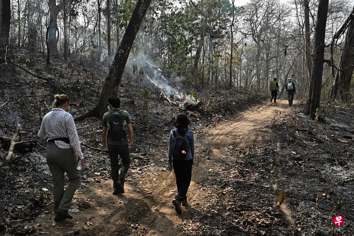 (泰国乌彭法新电)英国皇家植物园邱园的科学家比尔琴科与一组科学家在泰国西北部的乌彭野生动物保护区走了一公里又一公里,映入眼帘的不是被火焚烧过就是还在冒烟的植被,一抬脚步带起不少灰烬,当地动物如犀鸟、鹿、大象甚至老虎,一只也没有。