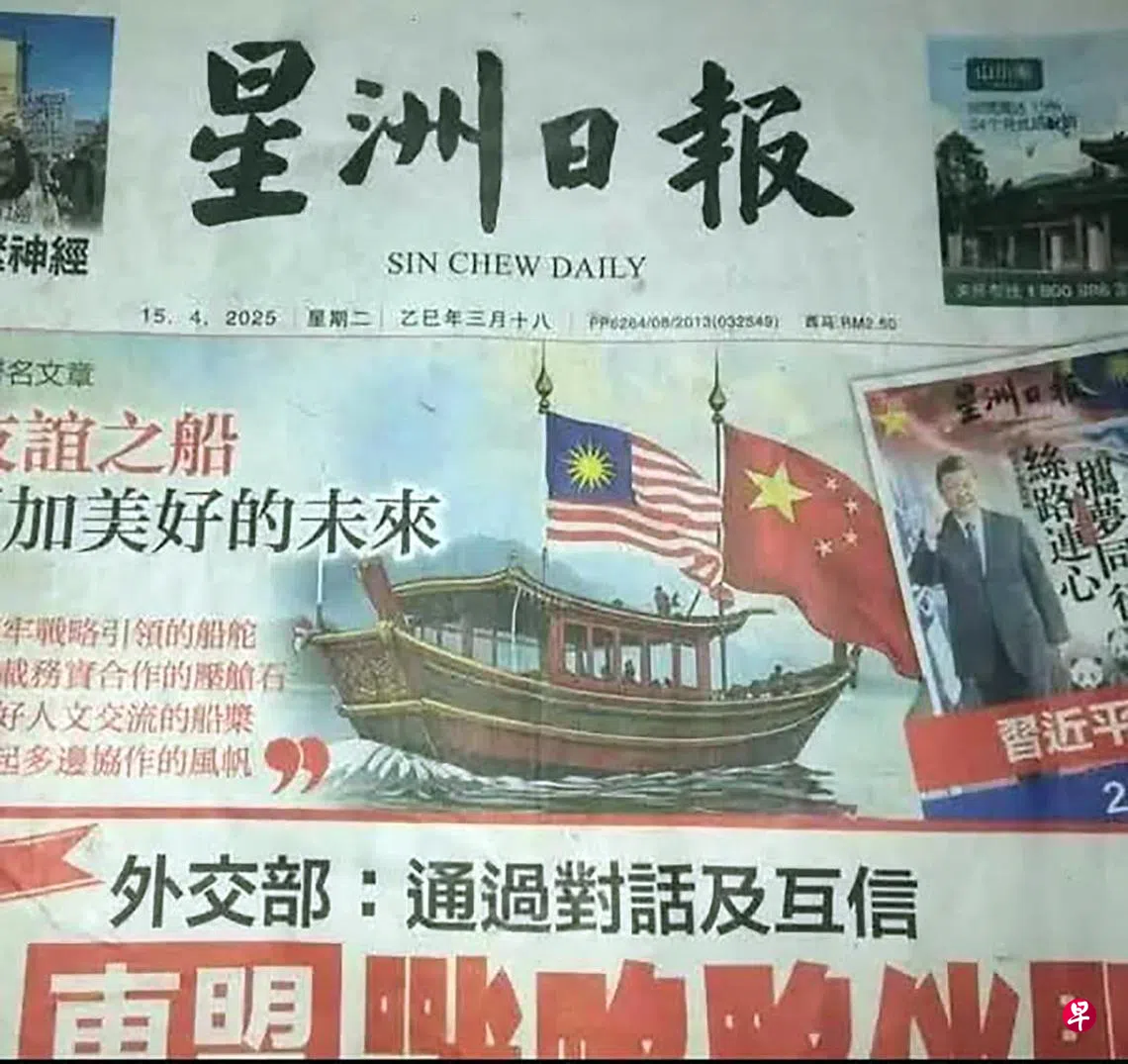 配合中国国家主席习近平访马,《星洲日报》星期二(4月15日)在封面刊登一张插图,图中一艘船上高挂马中两国国旗,但马国国旗却不见象征国家官方宗教回教的新月图案。