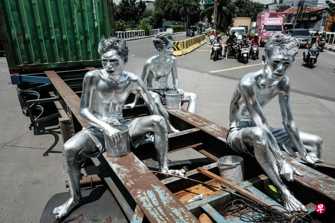 (雅加达法新电)印度尼西亚首都雅加达有一群打扮成“银人”的街头表演者。他们身穿短裤光着脚,全身涂满银色金属漆,专门在路口向司机或骑士乞讨。