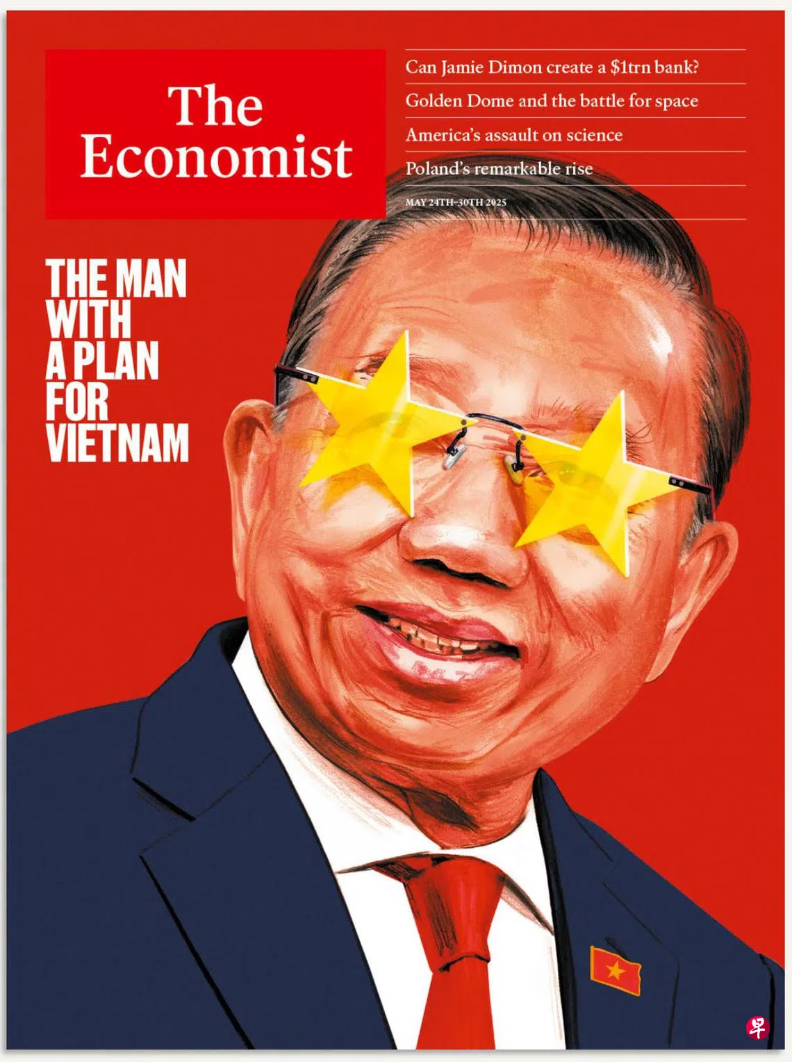 志日5月24日的《经济学人》封面是苏林的上半身肖像,以红色为背景,双眼被两颗五角星取代;红色和五角星象征越南国旗。封面大标题是“为越南制定计划的人”,内文标题则是“一位共产党硬汉必须拯救亚洲的伟大成功故事”。