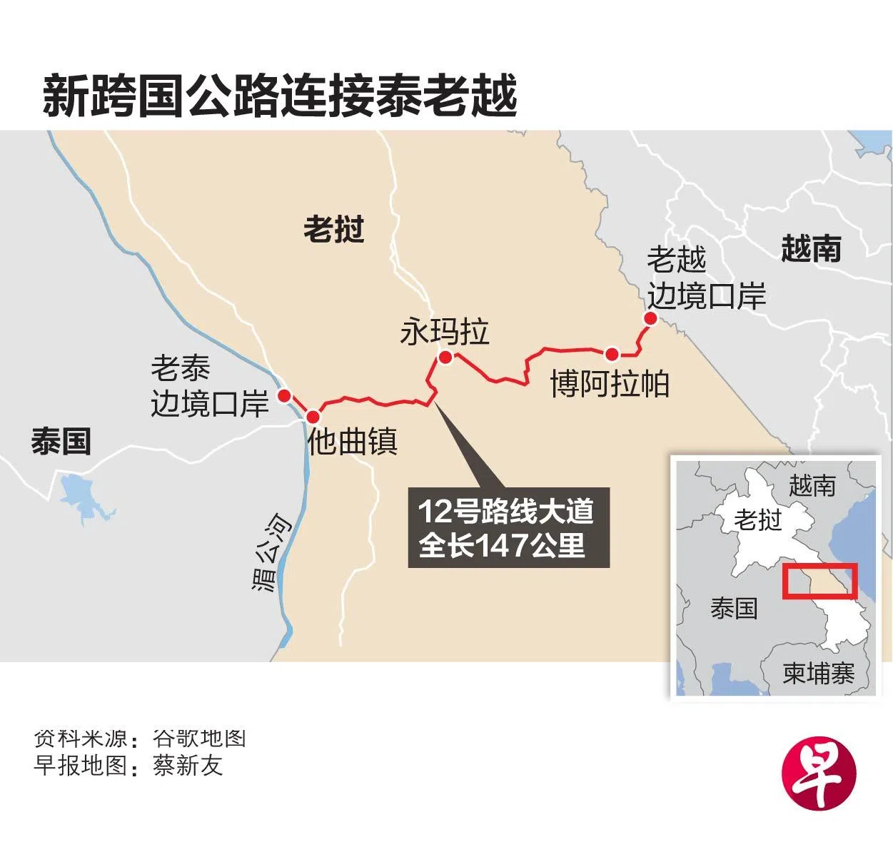 《曼谷邮报》报道,泰国邻国经济发展合作署(NEDA)主席贝拉梅介绍称,12号路线大道全长147公里,始自老挝甘蒙省他曲镇(Thakhek),连接永玛拉(Yommalath)和博阿拉帕(Boualapha)两个城镇,止于老挝纳包(Na Phao)关卡。