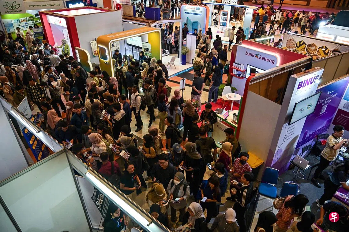 雅加达职业展的一个摊位,海伦娜卖着她亲自烘焙和调制的糕饼、玉米香肠和果汁。过去两年,她通过社交媒体营销,经营小本饮食生意,赚取微薄收入帮补家用。