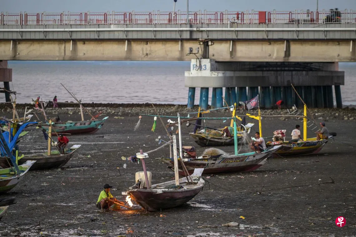 7月21日,海水退潮时,一群渔民在印度尼西亚泗水的苏拉马都大桥(Suramadu Bridge)旁整理船上渔网和工具,准备入夜后捕鱼。