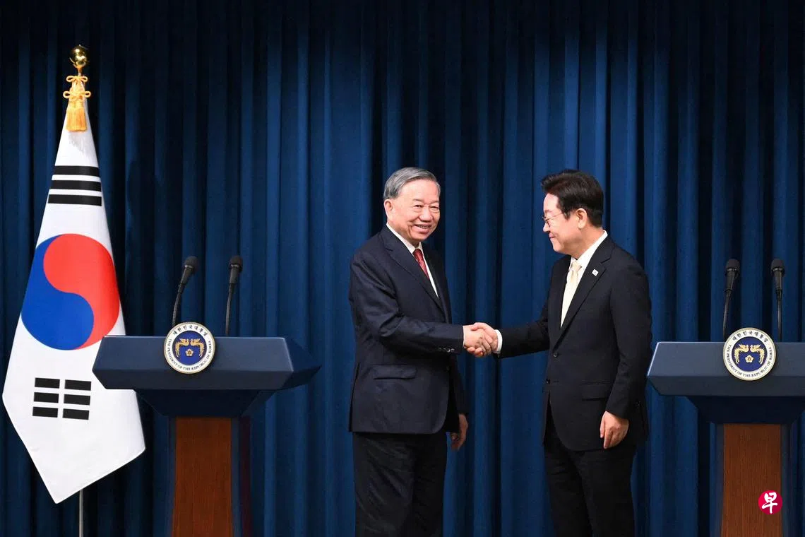 (首尔综合电)韩国和越南领导人星期一(8月11日)会晤,承诺深化两国经济与战略合作,巩固两国长期以来建立的供应链关系,应对美国对等关税措施所引发的全球贸易动荡。