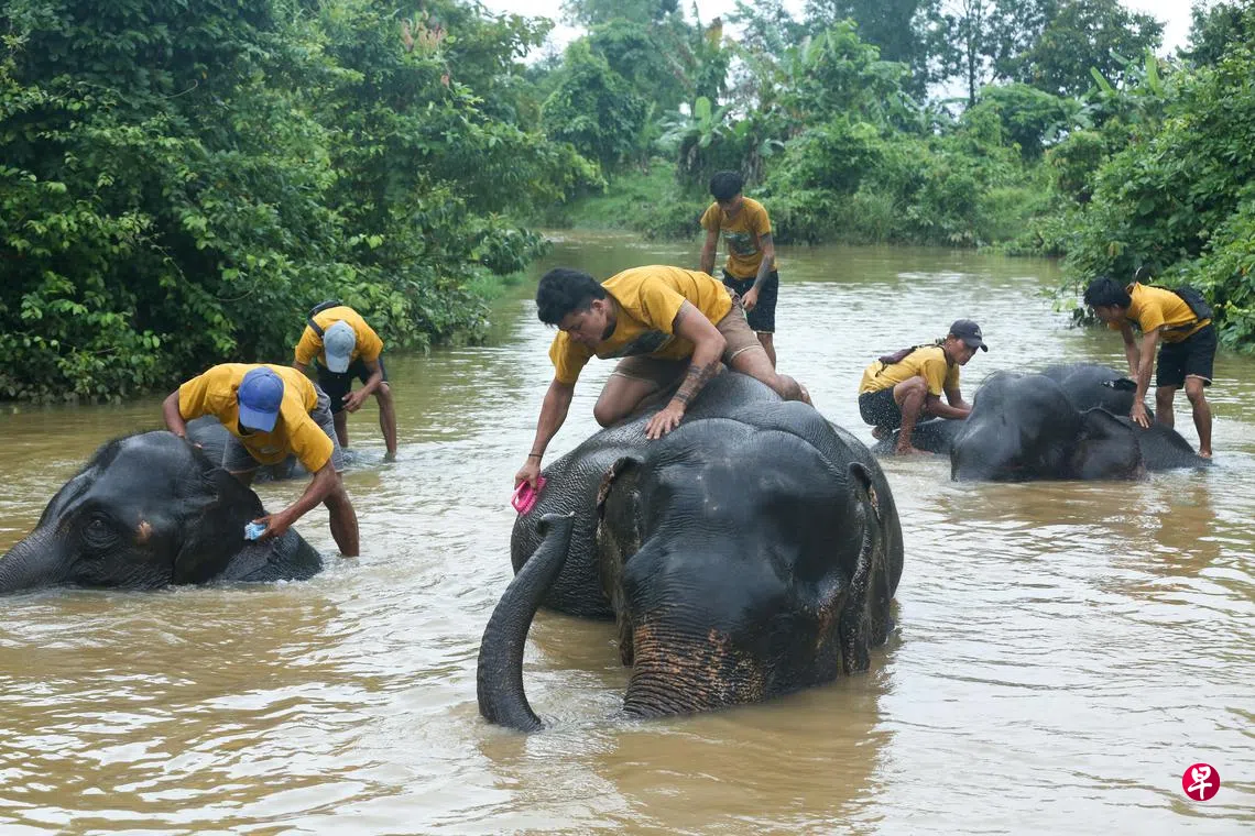 官方数据显示,截至2024年,缅甸有6000多头大象,其中约3200头为国家驯养,分布在23个大象保护营地。温加波大象营地建于2016年,致力于救助和收养大象“孤儿”。图为营地工作人员带着大象在附近小溪洗澡。(新华社)
