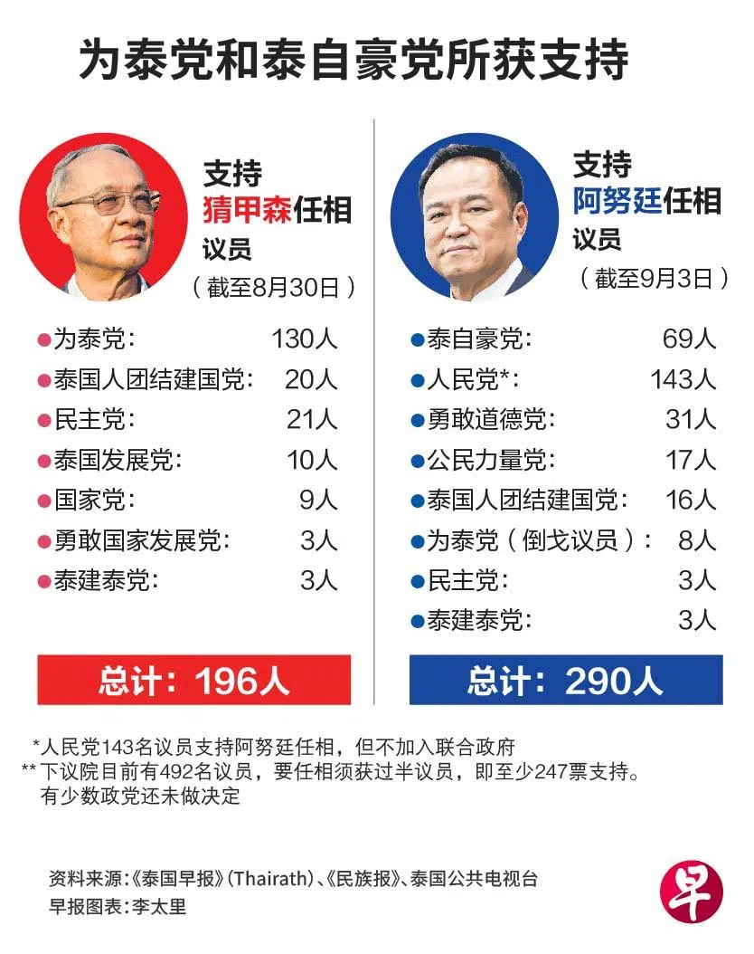 为泰党原首相佩通坦8月29日遭宪法法院撤职后,新任首相须获得下议院492席中的过半,即至少247票支持。泰自豪党周三获人民党支持后召开记者会说,该党还获得另六个党派共146名议员支持,意味着阿努廷已越过任相门槛。下议院将在周五(5日)召开特别会议选举新首相。